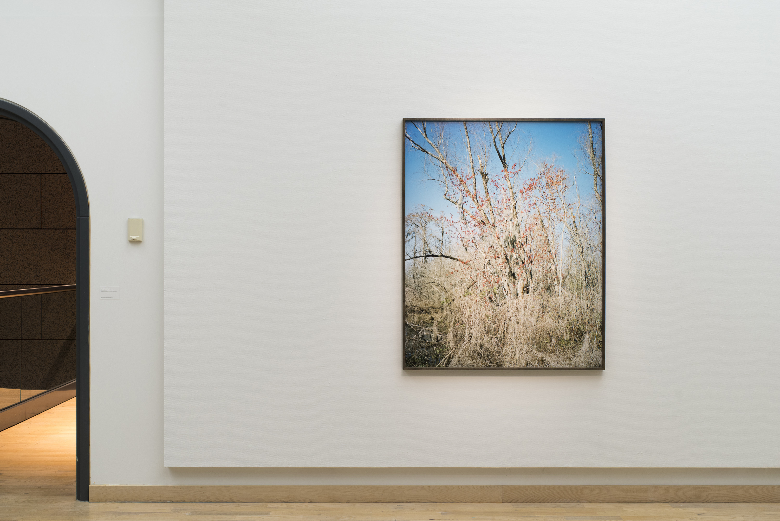 The photo series 08–18 (Past Perfect) was created over a decade of returns to Trinidad, Zimbabwe, Grenada, the United States, and Scandinavia. Sections of the gallery are hung with wallpaper treated with a mix of cyanotype chemicals, which, left unfixed, will shift and develop a darkening grey-blue tone as they are exposed to the winter sun over the course of the exhibition.
